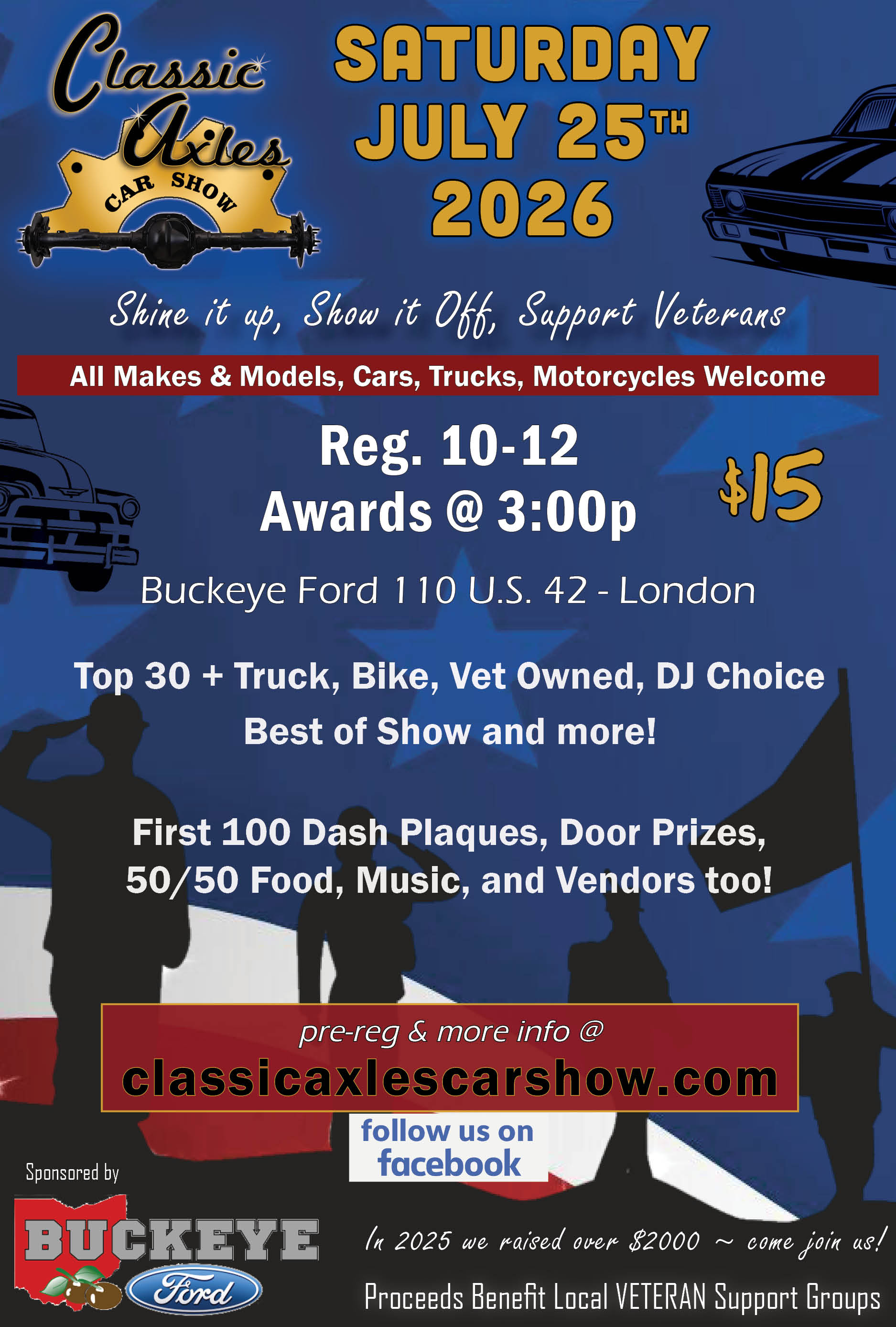 Classic Axles car show name images nor information shall be used for promotion of other events or organizations without prior consent. Funds taken in registration, raffles, donations and all other means in support of the show shall be non-refundable regardless of reason (weather/cancellation) All Funds held and distributed at the discretion of classic axles owners, provided net proceeds are forwarded to Veterans Organizations annually.